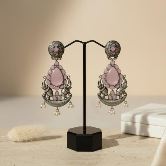 Chicshukra premium imitation earrings featuring a silver‑tone metal frame with intricate filigree top.