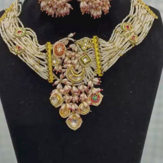 Includes matching earrings with Kundan center, pearl clusters, and pink gemstone embellishments.